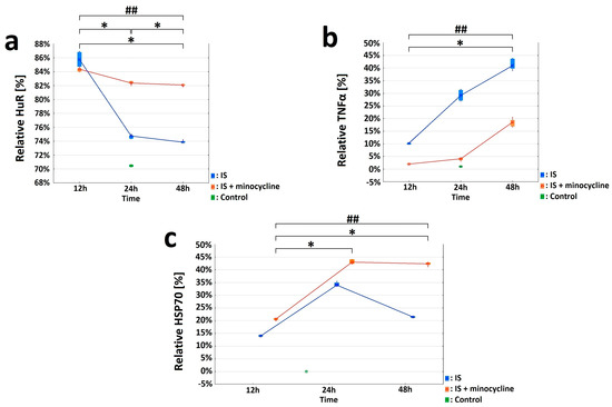 Effect of minocycline on selected parameters of inflammation after the induction of ischemic stroke in rats. HuR, TNFα, and HSP70 were investigated in the peri-infarct area after ischemic stroke induction: immunohistochemistry (IS: ischemic stroke groups; IS + minocycline: ischemic stroke + minocycline groups; Control: control group). (a) HuR and NeuN double - immunolabeled neurons. The variables “nNeuN”, “nHuR”, and “relative HuR” show statistically significant difference (KruskalWallis test, p = 0.0002). S1 vs. Control, S2 vs. Control, S3 vs. Control, S1 vs. S3, and S1 + m vs. S3 + m showed a statistically significant difference (Dunn’s post hoc test, p < 0.05). S1 + m vs. Control, S2 + m vs. Control, S3 + m vs. Control, S1 vs. S3, and S1 + m vs. S3 + m showed a statistically significant difference for the relative “HuR” variable (Dunn’s post hoc test, p < 0.05), where * p < 0.05 for intragroup comparisons and comparisons with the control group. Comparing the groups without the administration of minocycline and with the administration of minocycline at each time point revealed the presence of statistically significant differences for all the three examined variables, “nNeuN”, “nHuR”, and “relative HuR”, in favor of the minocycline groups (Mann-Whitney U test, p = 0.002), where ## p < 0.01 for the comparison of groups without versus groups with the administration of minocycline. (b) TNFα and NeuN double-immunolabeled neurons. The obtained results for the “nNeuN”, “nTNFα”, and “relative TNFα” variables showed statistically significant differences for all variables only between the S2 vs. Control groups (Kruskall-Wallis, p = 0.0005; Dunn’s post hoc test, p < 0.05). For each studied variable, the pairs S1 vs. S3 and S1 + m vs. S3 + m were statistically significant (Dunn’s post hoc test, p < 0.05), where * p < 0.05 for intragroup comparisons and comparisons with the control group. The occurrence of differences between the groups without minocycline and with minocycline at each time point were compared for the “nNeuN”, “nTNFα”, and “relative TNFα” variables. All three variables were statistically significantly different at each time point between the groups without minocycline and with minocycline (Mann-Whitney U test, p = 0.002), where ## p < 0.01 for the comparison of groups without versus groups with the administration of minocycline. (c) HSP70 and NeuN double-immunolabeled neurons. The values of the “nNeuN”, “nHSP70”, and “relative HSP70” variables showed a statistically significant difference between all groups without minocycline and those with minocycline (Kruskall-Wallis test, p = 0.0001). The pairs S1 vs. S3 and S1 + m vs. S3 + m showed a statistically significant difference (Dunn’s post hoc test, p < 0.05) for the “nNeuN” and “nHSP70” variables. The pairs S1 vs. S3, S1 + m vs. S2 + m, and S1 + m vs. S3 + m showed a statistically significant difference in the “relative HSP70” variable (Dunn’s post hoc test, p < 0.05), where * p < 0.05 for intragroup comparisons and comparisons with the control group. The “nNeuN”, “nHSP70”, and “relative HSP70” variables results showed statistically significant differences (Mann-Whitney U test, p = 0.002) between the groups without minocycline and those with minocycline at all time points examined, where ## p < 0.01 for the comparison of groups without versus groups with the administration of minocycline.