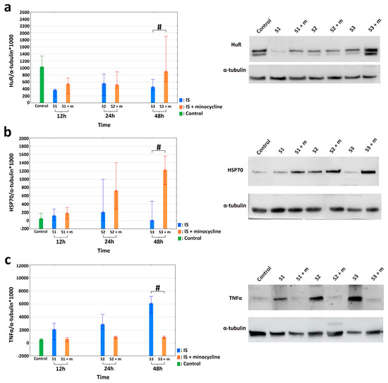 Effects of minocycline administration on selected markers of inflammation after photothrombotic stroke in rats. HuR, TNFα, and HSP70 levels in the peri-infarct area after ischemic stroke induction; Western blotting (IS: ischemic stroke groups; IS + minocycline: ischemic stroke + minocycline groups; Control: control group). (a) HuR protein levels: the results confirmed a significantly higher HuR protein expression in the S3 + m rats compared to the S3 group after FCI induction (the Mann Whitney U, p = 0.041), where # p < 0.05 for the comparison of groups without versus groups with the administration of minocycline. (b) HSP70 protein levels: the results confirmed a statistically significant difference in HSP70 protein expression between the S3 and S3 + m groups (Mann Whitney U, p = 0.025), where # p < 0.05 for the comparison of groups without versus groups with the administration of minocycline. (c) TNFα protein levels: there was a statistically significant difference between the S3 and S3 + m groups (Kruskall-Wallis test, p = 0.004; Dunn’s post hoc test, p = 0.0362), where # p < 0.05 for the comparison of groups without versus groups with the administration of minocycline.