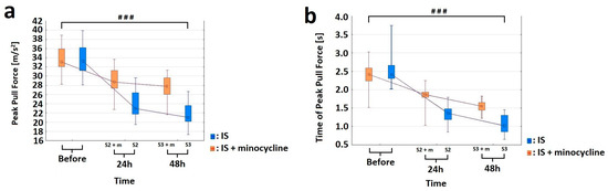 Effect of minocycline on the strength level of the front paws after prothrombotic stroke induction in rats: Grip Strength test. Administration of minocycline after stroke increased front paw strength relative to animals without minocycline. (a) For the “peak pull force” variable, the analysis of variance showed statistically significant differences in the mean values of the variable between the S2 vs. S2 + m groups (ANOVA, p = 0.0254) and as a function of time (ANOVA, p = 0.0000). The interaction between these two factors, group and time, was significant (ANOVA, p = 0.0000). The comparison showed that each time point at which the measurement was made differed from the other (The Bonferroni post hoc test, p < 0.001), where ### p < 0.001 for comparison of groups without versus groups with the administration of minocycline. (b) For the “time of peak pull force” variable, the analysis was significant for the two factors “group” (ANOVA, p = 0.00001) and “time” (ANOVA, p = 0.0000), as well as for the interaction between these two factors (ANOVA, p = 0.00000). The comparison showed that each peak time at which the maximum power was reached was different from the other (Bonferroni post hoc test, p < 0.001), where ### p < 0.001 for the comparison of groups without versus groups with the administration of minocycline.