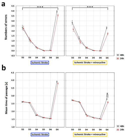 Influence of minocycline on the speed of passage and the number of errors after induction of prothrombotic stroke in rats: Horizontal runway elevated test (HRE). The administration of minocycline after stroke increased the speed of passage through the beam and reduced the number of errors made. (a) Concerning the “sum of errors”, an analysis of variance was performed: “beam passage time” (ANOVA, p = 0.0009) and “minocycline” (ANOVA, p = 0.009) influenced the number of errors made by the rats. Moreover, the interaction between “minocycline” and “beam passage time” showed a statistically significant result (ANOVA, p = 0.0000). The “beam passage time” interaction with groups (pre-stroke vs. 24 h post FCI vs. 48 h post FCI) also reached a statistically significant result (ANOVA, p = 0.0309). Training days (D2–D5) and testing days (D6 and DX) differed significantly in terms of the average number of errors (ANOVA, p = 0.0000). Interactions between “minocycline” over time were statistically significant (ANOVA, p = 0.0000), as well as the beam passage time interaction between groups (pre-stroke vs. 24 h post FCI vs. 48 h post FCI; Bonferroni post hoc test, p < 0.05), where *** p < 0.001 for intragroup comparisons. (b) With respect to the “mean time of passage”, the analysis of “mean time of passage” was performed. The variable was affected by training (D2–D5), time elapsed since FCI induction (24 h post-induction or 48 h post-induction), and minocycline administration (ANOVA, p < 0.05). The animals without minocycline had a higher mean time of passage. In the case of the animals with minocycline, time played a role—the animals passed the beam slower 48 h after the procedure than after 24 h (Bonferroni post hoc test, p < 0.05). The administration of minocycline resulted in a statistically significant reduction in the time needed for minocyclinetreated rats to pass the beam both 24 h and 48 h after FCI compared to the animals without minocycline (the Bonferroni post hoc test, p < 0.05); where * p < 0.05 for intragroup comparisons.