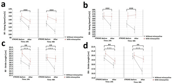 Effect of minocycline on gait speed and stride length in rats after ischemic stroke: CatWalk XT. Selected gait parameters improved after minocycline administration for both the right front (RF) and right hind (RH) paws. For the variable “Swing speed” (a,b) the analysis showed a decrease in RF (ANOVA, p = 0.0003) and RH (ANOVA, p = 0.001) movement speed after FCI induction. The animals receiving minocycline had a statistically significantly faster swing speed than animals without minocycline in each time group (ANOVA, p = 0.0001). Concerning the “Stride length” variable (c,d), the analysis revealed the effect of both stroke induction (ANOVA, p = 0.003) and minocycline (ANOVA, p = 0.008) on the RF stride length. Following FCI, animals without minocycline made an approximately 1.5 cm shorter step compared to animals with minocycline 48 h following FCI. The analysis of variance for RH showed the effect of both stroke induction (ANOVA, p = 0.0000) and minocycline (ANOVA, p = 0.009) on RH stride length. Following FCI, the animals without minocycline had an approximately 3.0 cm shorter RF stride compared to the animals with minocycline 48 h following FCI, where *** p < 0.001 for intragroup comparisons and ## p < 0.01, ### p < 0.001 for the comparison of groups with and without the administration of minocycline.