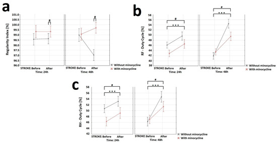 Effect of minocycline on gait regularity and step interval in rats after ischemic stroke induction: CatWalk XT. Selected gait parameters improved after minocycline administration for both the right front (RF) and right hind (RH) paws. Regarding the “Regular Index” variable (a), the analysis showed the effect of minocycline on the level of steps regularity (ANOVA, p = 0.013). Groups S2 and S3 displayed a decrease in step regularity after FCI compared to animals given minocycline (S2 + m and S3 + m). With respect to the “Duty cycle” variable (b,c), the analysis of the RF showed the effect of stroke induction (ANOVA, p = 0.00000), minocycline (ANOVA, p = 0.0307), and time interval (ANOVA, p = 0.006) on this parameter. For the RH, the results showed the effect of stroke induction (ANOVA, p = 0.000057), minocycline (ANOVA, p = 0.03589), and time interval (ANOVA, p = 0.00751) on this parameter, where *** p < 0.001 for intragroup comparisons, and # p < 0.05 for the comparison of groups with and without administration of minocycline.