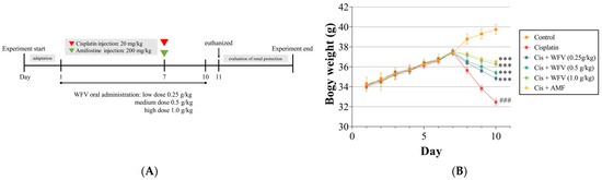 The experiment was designed as shown in Figure 1A. It was observed that the group of mice induced with cisplatin on the seventh day showed a decrease in bodyweight (Figure 1B), which initially indicated the success of cisplatin induction. Amifostine (AMF) is a cytoprotective agent used in cancer therapy to reduce side effects [16]. In the group given AMF, bodyweight did not significantly decrease after cisplatin injection compared to the cisplatin group. On the other hand, in the group given WFV, weight loss decreased with increasing dosages and was most pronounced at 1.0 g/kg WFV.