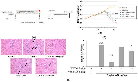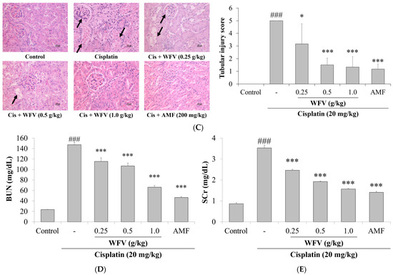 Male ICR mice (8 weeks old, weighing 30–35 g) were purchased from BioLASCO Taiwan Co., Ltd. (Taipei, Taiwan). Animals were maintained according to the standard animal protocol approved by China Medical University (CMUIACUC-2019-377). Starting 3 days before the experiment, mice were subjected to a 12 h light/dark cycle, with temperature maintained at 23 °C and relative humidity at 50%. Mice were divided into six groups (5 mice per group): (1) control group; (2) cisplatin group; (3) AMF + cisplatin group; (4) low-dose (0.25 g/kg) WFV + cisplatin group; (5) medium-dose (0.5 g/kg) WFV + cisplatin group; (6) high-dose (1.0 g/kg) WFV + cisplatin group. AMF was used as positive control. Based on previous results, mice were orally administered WFV at doses of 0.25, 0.5, or 1.0 g/kg once daily for 10 days [58]. The dose of cisplatin was selected based on a previous study [47]. Mice were given a single intraperitoneal (IP) injection of 20 mg/kg cisplatin dissolved in 0.5% carboxymethyl cellulose solution on day 7 to induce AKI. Mice were sacrificed 72 h after cisplatin injection, and blood samples were collected to measure serum biomarkers. One kidney was collected for tissue sectioning, and the other kidney was collected for subsequent analysis.