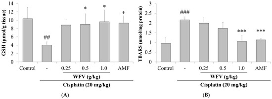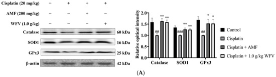 Cisplatin decreases antioxidant enzyme activity and depletes intracellular glutathione (GSH) concentrations, leading to an accumulation of ROS in RTECs [18]. In contrast to the control group, the cisplatin group had decreased GSH levels and increased malondialdehyde (MDA) levels, as seen in Figure 2. On the other hand, by lowering the level of MDA and raising the level of GSH, the 1.0 g/kg WFV + cisplatin group had decreased oxidative stress in cisplatin-induced AKI. The protein expression levels of antioxidants in the kidney were further examined. The results show that catalase, SOD1, and GPx3 were attenuated in the cisplatin group (Figure 3A), while this condition was restored in the 1.0 g/kg WFV + cisplatin group, like in the AMF + cisplatin group.