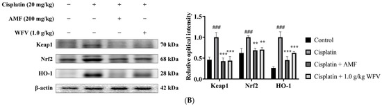 In addition, ROS accumulation in the kidney activates Nrf2-dependent cytoprotective gene and transporter production in RTECs [19]. Figure 3B shows the expression of the Keap1/Nrf2/HO-1 pathway in the kidney. Because of the increased renal oxidative stress induced by cisplatin, the cisplatin group showed a higher expression of Keap1, Nrf2, and HO-1 than the control group. Pretreatment with WFV protects the kidney from the oxidative stress caused by ROS accumulation.