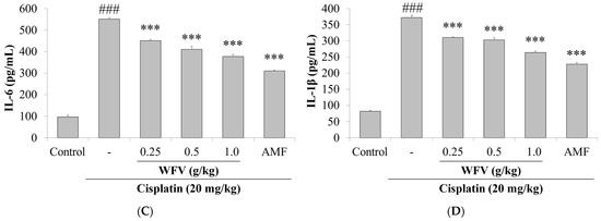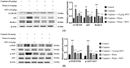 Autophagy, as an adaptive mechanism, is thought to be a general response to the stresses that lead to cell death [27]. It was found that the exposure of renal proximal tubular epithelial cells to cisplatin resulted in a significant increase in autophagic markers, indicating the development of autophagy [28]. As shown in Figure 6B, WFV downregulated the protein expression of LC3B I/II, p62, and Beclin-1 compared to the cisplatin group. These results suggest that the pre-administration of WFV helped to protect from cisplatin-induced nephrotoxicity and improved the expression of apoptosis and autophagy in the kidney, which is similar to the results of the AMF + cisplatin group.