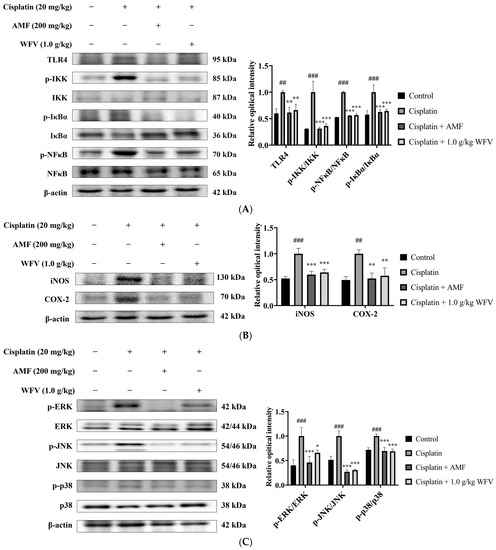 iNOS and COX-2, the target genes of NF-kB, are pro-inflammatory cytokines [23]. As the results in Figure 5B show, similarly to the results of inflammatory cytokines in serum, iNOS and COX-2 in the kidney were highly expressed in the cisplatin group, while WFV downregulated their expression. The MAPK pathway is another downstream mediator of TLR4 signaling, and its activation has been associated with tissue damage in a variety of organs, including the kidney [24]. The phosphorylation states of MAPKs can be seen in Figure 5C. By administering WFV, the expression of p-ERK, p-JNK, and p-p38 was downregulated. Once more, these findings indicate that WFV reduced inflammation by altering the aforementioned mechanisms.