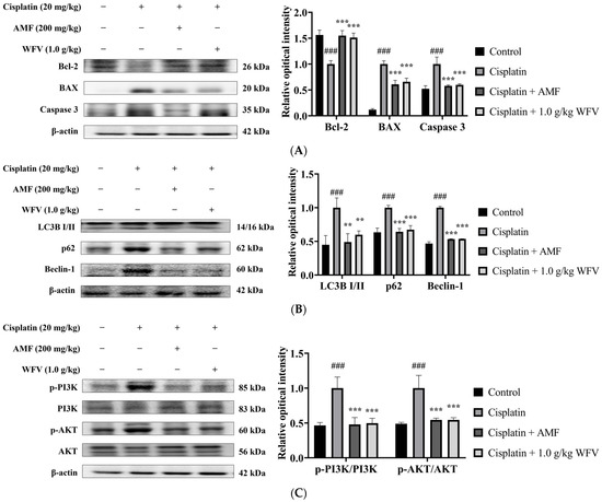 Cellular stress triggers the PI3K/AKT pathway, which is then involved in the regulation of a number of physiological activities within cells [29]. It was found that AKT initiates autophagy by activating downstream signaling [30]. Our results show that the accumulation of oxidative stress caused an increase in PI3K and AKT expression in the cisplatin group (Figure 6C). The results of AMF and WFV administration were similar to the results of the control group, indicating that WFV protects the kidney from cisplatin-induced cellular stress.