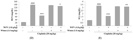 The measurement of blood urea nitrogen (BUN) and creatinine (SCr) revealed renal insufficiency in the cisplatin group compared to the control group (Figure 1D,E). If WFV was given, the levels decreased with increasing WFV doses, similarly to the results of the AMF + cisplatin group.