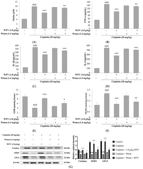 WFV with or without PI3K inhibitor influenced inflammation and oxidative stress. Measurements include levels of (A) NO, (B) TNF-α, (C) IL-1β, (D) IL-6, (E) GSH, and (F) MDA. Data are expressed as mean ± SD (n = 5). (G) Antioxidant enzymes were detected by Western blot, including catalase, SOD1, and GPx3. Experiment was repeated three times, from which one set of data was selected for illustration. ### p < 0.001 compared to control group; * p < 0.05, ** p < 0.01, and *** p < 0.001 compared to cisplatin group.