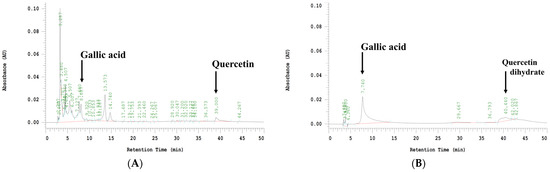 HPLC profiles of WFV and standard compounds. (A) Water extract from brown strain of F. velutipes (WFV) and (B) 50 ppm gallic acid plus 200 ppm quercetin dihydrate as standard.