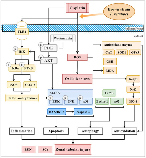 The experimental mechanism is illustrated in Figure 11. This study demonstrated the following: Pretreatment with oral WFV reduced cisplatin-induced kidney injury, as assessed based on renal function and histology. WFV demonstrated antioxidant, anti-inflammatory, and anti-apoptotic functions in cisplatin-induced AKI. WFV administration significantly reduced autophagy activation. With the use of PI3K inhibitors, the protective effect of WFV on the kidneys was found to be associated with the PI3K/AKT pathway. Overall, our study confirms the pharmacological activity of the brown strain of F. velutipes for renal protection via the TLR4/NF-κB, MAPK, Nrf2/HO-1, and PI3K/AKT pathways and provides new evidence for its use as a nutritional support for patients with AKI.