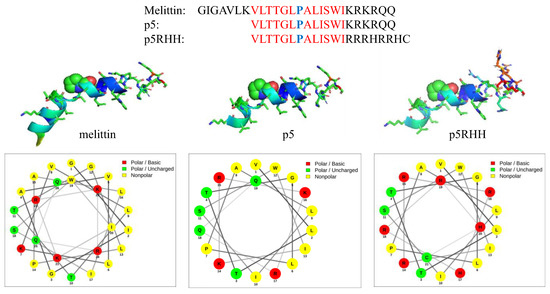 Amphiphilic Peptide Examples: Melittin, p5, and p5RHH sequences. Both the primary and secondary amphiphilicity is exhibited by melittin and its modified versions, p5 and p5RHH. Peptide helical wheels were generated by using a web application [53].
