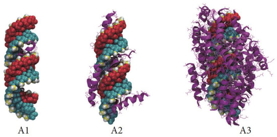 Predicted structures of CPP and anti-GAPDH siRNA in A-form complex from docking calculations. Pictures show the CADY peptide representing the amphipathic class of CPPs. The peptide to siRNA ratios are 1:1 (A1), 5:1 (A2), and 30:1 (A3), respectively. From Rathnayake et al. [10].