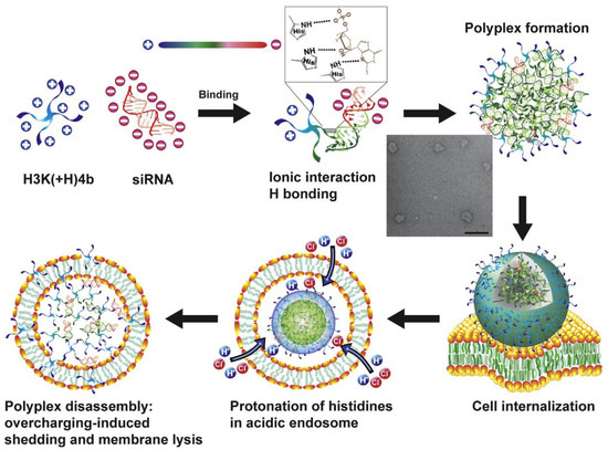 Other mechanistic observations on the hydrogen bonding properties of H in PBN complexes have been described by Mixson and colleagues. Chou et al. reported enhanced stability of linear histidine-lysine (“HK“) rich polyplexes forming nonionic hydrogen bonds with siRNA via the imidazole group nitrogens that exhibited improved transfection capacity (Figure 3) [63]. The initial interaction between H imidazole and siRNA was exothermic and energetically favorable. The authors opined that unpacking of the polyplexes was likely due to “overcharging “consistent with Bechinger’s explanation above and the modeling studies of Rathnayake (above) indicating reduced binding energies with increasing positive charge. Accordingly, protonation would promote charge–charge repulsion of the polyplex constituents, resulting in the break-up of the polyplex.