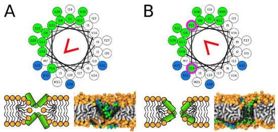 Proline (P) residues in alpha helices tend to break or kink a helix formation to force a bend of about 30° in the helix’s axis to establish a helix-hinge-helix structure. Because P has no amide hydrogen, it cannot donate an amide hydrogen bond, while its sidechain also sterically hinders the helix backbone. Previous work by Lee et al. has shown that the introduction of P into a short amphipathic negative peptide induces a “kink “in the alpha helical structure [91]. This substitution facilitates micropore formation (<2 nm) and membrane translocation of the peptide rather than more typical membrane insertion. In this case, antimicrobial activity was enhanced through membrane penetration and subsequent cytoplasmic and nuclear interactions, although red cell hemolysis was not affected, consistent with formation of a small and transient pore.