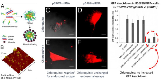 p5RHH formation, endosomal escape, and transfection. (Left): (A) Particle assembly with a selected N:P ratio forms a mature polyplex within 40 min followed by coating with an albumin corona, as shown in the atomic microscopy image in (B). (Middle): The ineffective p5RWR peptide forms siRNA nanoparticles but cannot escape from endosomes unless treated with chloroquine (note punctate appearance in (C) emerging into cytoplasm as diffuse distribution in (D)). Chloroquine releases sequestered endosomal siRNA contents for the ineffective PBN nanostructures (E), but no additional release is noted for the effective p5RHH nanostructures (F) because the p5RHH peptide-siRNA complex naturally escapes endosomes. (Confocal microscopy scale bars: 10 mm). (Right): Anti-GFP siRNA knockdown in GFP-expressing melanoma cells is extensive with p5RHH polyplexes but not augmented by chloroquine, indicating that siRNA release is complete. However, p5RWR polyplexes cannot transfect and knockdown even with chloroquine. The addition of tight binding arginines and tryptophan to p5RWR, together with the lack of histidines that blocks pH-dependent peptide protonation, prevents particle disassembly and compromises efficacy. Adapted from Hou et al. [51,52].