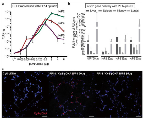 Optimization of plasmid DNA delivery with PepFect14. (a) The effect of increasing pLuc dose (up to 6 μg) on transfection efficacy in CHO cells using three different N/P ratios for complexing PF14 with pDNA. (b) In vivo reporter gene delivery efficacies of CPP/pLuc at N/P4, compared to N/P2. pDNA doses, formulated with PF14 at indicated N/P, are shown in the X axis. Data are represented as a fold increase of RLU/mg over sham treatment (using the same dose of naked pDNA). (c) Accumulation of PF14/pDNA nanoparticles in lung tissue, using Cy5-labeled pDNA. The cryosections of the lungs represent 1 h post-injection. Scale bar 50 μm. From Kurrikov et al. [152].