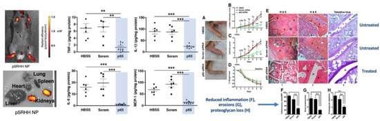 Systemic Extrahepatic Delivery of p5RHH-siRNA. Polyarticular arthritis induced by anti-collagen antibodies and LPS in mice treated with anti-NF-kB (p65) siRNA-p5RHH PBN. Note delivery to inflamed paws and renal clearance with no appreciable deposition in liver or spleen 24 h after i.v. injection (left panels). Broad and potent suppression of inflammatory cytokines in p65 treated subjects (shaded in blue) were observed (middle panels), where triangles, circles, and squares represent buffer (HBSS), scrambled siRNA (Scram), and p65 siRNA (p65) treatments respectively. Beneficial reductions of inflammation and joint destruction 11 days after three serial i.v. doses (right panels). (A) shows the reduction of paw inflammation after p65 treatment. (B,C) show reduction of ankle thickness and arthritis score, respectively; and (D), no effect of treatment on weight. (E) shows joint histology indicating reduction of inflammation (scale bars: 400 μm (left), 100 μm (middle), 50 μm (right). (F–H) show the effect of p65 siRNA treatment on inflammatory cells, bone erosions and proteoglycan depletion. Stars (*) indicate significant differences in all panels. Adapted from Zhou et al. [129].