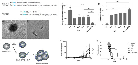 Amphipathic PBN peptide features are important not only in interactions with lipid membranes in the manner of cell penetrating peptides but also in noncovalent interactions with nucleotides [54]. Attractive Coulombic interactions between cationic peptides and anionic nucleotides initiate associations, which then are consolidated by hydrogen bonding, hydrophobic, and other forces available for noncovalent peptide interactions [55,56,57,58]. An incubation period of 30–60 min appears typical in most reported batch process formulations to complete the process of nanostructure self-assembly. The exact ratios of peptide to nucleotide, which are expressed either as the charge ratio of peptide nitrogen to nucleotide phosphate (N:P) or in molar ratios, are specified to achieve a desired particle size, charge, and stability that are critical for transfection. Depending on the peptide length, charge, amphiphilicity, exact amino acid composition, salt concentration, and other features, these ratios can vary considerably.