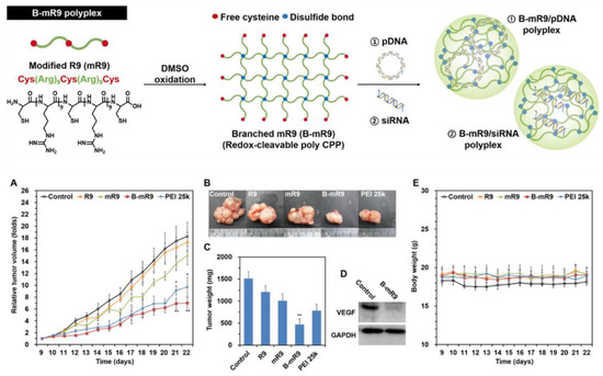 - Yoo, J.; Lee, D.; Gujrati, V.; Rejinold, N.S.; Lekshmi, K.M.; Uthaman, S.; Jeong, C.; Park, I.K.; Jon, S.; Kim, Y.C. Bioreducible branched poly(modified nona-arginine) cell-penetrating peptide as a novel gene delivery platform. J. Control Release 2017, 246, 142–154. [Google Scholar] [CrossRef]