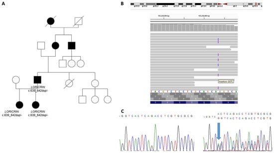 FAMILY 1: (A) pedigree; (B) results of NGS analysis showing c.639_642dup site in the LORICRIN gene, the IGV view; (C) confirmatory Sanger sequencing showing fragment of the wild type LORICRIN sequence (left one) and the sequence with heterozygous c.639_642dup (right one, marked by an arrow).