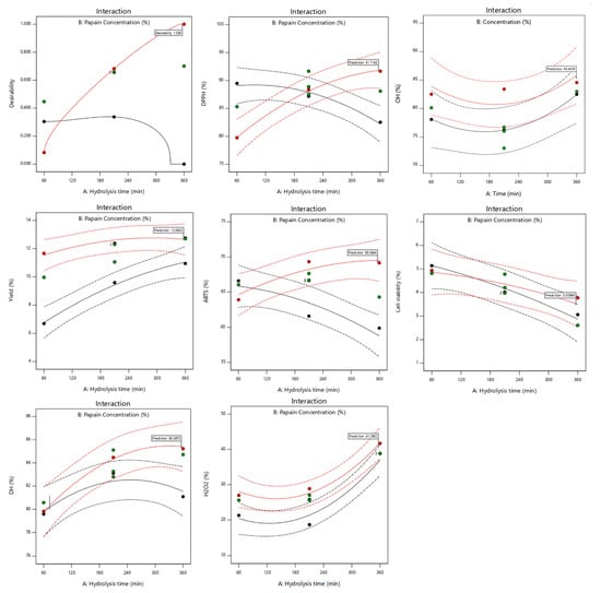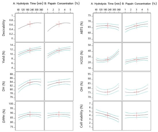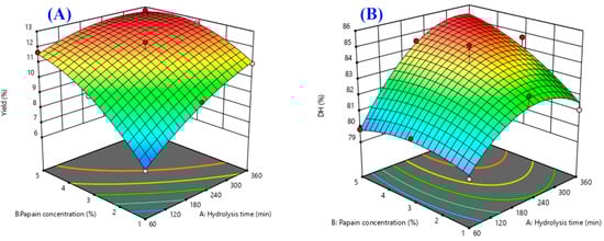 Response surface plots were drawn as three-dimensional and contour plots (Figure 1, Figure 2 and Figure 3), which show the relationship between two factors (hydrolysis time: X1 and papain concentration: X2) and the responses, including yield (%), DH (%), DPPH radical scavenging activity (%), ABTS radical scavenging activity (%), H2O2 radical scavenging activity (%), OH· radical scavenging activity (%), and antiproliferative activity in the HepG2 liver cancer cell line (%HepG2 cell viability).