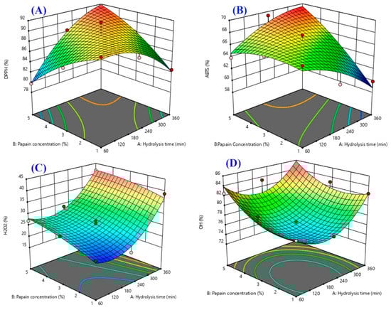 The 3D and contour plots of the hydrolysis time (X1: min) against the concentration of papain (X2: %) for the antioxidant activities, such as DPPH radical scavenging activity (A), ABTS radical scavenging activity (B), H2O2 scavenging activity (C), and OH· radical scavenging activity (D).