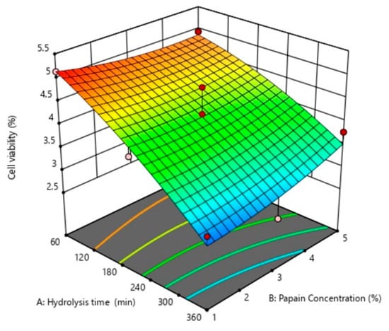 The effects of X1 and X2 on the cell viability of the HepG2 liver cancer cell line of the sea cucumber hydrolysate are shown in Figure 3. Only the X1 variable had significant main effects on cell viability (Figure 4), while there was no interaction effect (Figure 5). The hydrolysis time had an increasingly significant effect as cell viability decreased. This study is consistent with the results of Hsu et al. [18]. These authors reported that the hydrolysis time influenced the antiproliferative activity in cancer cells of the tuna dark meat hydrolysate using papain, in which the strongest antiproliferative activity was obtained at hydrolysis times of 60 and 120 min. Chi et al. [5] reported that the hydrolysate of bloody clam meat exhibited good free radical scavenging activities and promoted anticancer activity by inducing cell apoptosis and inhibiting cell proliferation. The anticancer activities of hydrolysates or peptides are associated with their antioxidant activities. Ishak and Sarbon [30] reported that small peptides derived from fish-processing byproducts have good anticancer activity, especially MW, ranging from 300 to 1950 Da. This is because the lower MW peptides have greater molecular mobility and diffusivity than those of higher MW peptides.