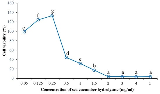 Cell viability of the HepG2 liver cancer cell line treated with the sea cucumber protein hydrolysate for 24 h at various concentrations. Different letters in the same column indicate statistical differences (p ≤ 0.05).