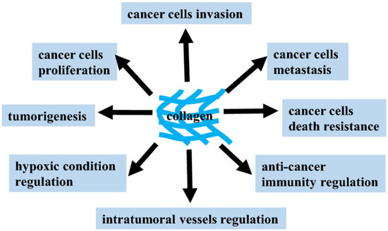 18]. MMPs are secreted by various cells (fibroblasts, macrophages, smooth muscle cells of the vascular wall, neutrophils, chondrocytes, osteoblasts, keratocytes, etc.) and hydrolyze all components of the extracellular matrix (EM): all collagens and procollagens, proteoglycans, elastin, fibronectin, laminin, as well as adhesive and other connective tissue proteins. Under physiological conditions, there is a balance between the synthesis and breakdown of collagen, which prevents the process of tumor malignancy. Any change in the structure of the ECM means a violation of the stable balance between the rates of synthesis and degradation of its proteins. The degradation of ECM components is carried out by endogenous matrix MMPs. These enzymes play a crucial role in the development of such physiological processes as tissue remodeling, migration, adhesion, cell differentiation and proliferation. It is now known that an increase in MMP activity does not necessarily imply the promotion of tumor growth or metastasis. Moreover, some MMPs have been shown to play a protective role in cancer. It is important to note that the ECM changes strongly in tumors, and these changes can be both protumor and antitumor in nature. There is evidence that MMP-1, -3, -7, -9, -14, -16 and -19 can degrade and regulate endothelial vascular growth factor (VEGF) bioavailability and vascularization in cancer. Exposure of ECM components such as collagen IV, XVIII, perlecan, and heparan sulfate proteoglycan 2 (HSPG2) by various MMPs (-1, -2, -3, -9 or -13) can initiate the production of anti-angiogenic products, such as tumstatin, endostatin, angiostatin and endorepellin [