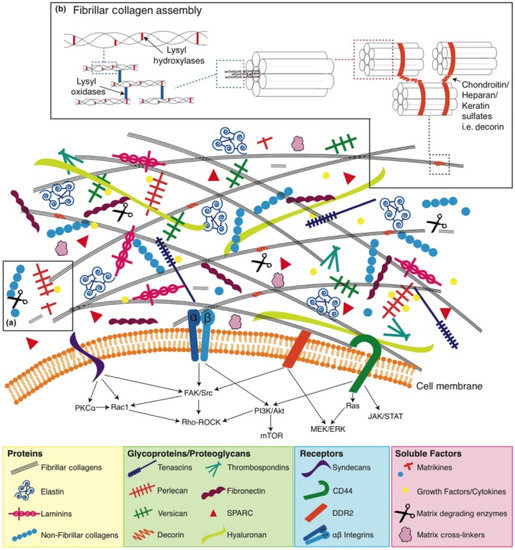 Our knowledge about the structure and functions of the ECM has expanded significantly over the past decades. There is evidence that ECM components (MKs) provide signals that affect the adhesion, migration, proliferation, survival and differentiation of various cell types due to the content of a large number of domain structures that become active after proteolytic cleavage. Moreover, these active fragments of ECM components can act as powerful inflammatory mediators for tissue damage. A growing body of evidence suggests that the ECM plays an important role in tumor development through changes in macromolecular components, degradation enzymes and tissue stiffness. These variations are controlled by cellular components in tumor tissue through the aberrant activation of signaling pathways and the interaction of ECM components with multiple surface receptors. Moreover, the deep regulatory network of ECM remodeling hinders effective antitumor therapy [