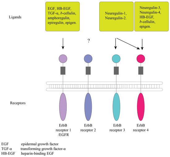 Representation of the ErbB receptors and ligands. The acronyms are as follows: EGF, epidermal growth factor; TGF-α, transforming growth factor-α; HB-EGF, heparin-binding EGF, ?—symbol indicates that it is unknown with what ErbB2 binds to [27].