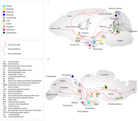 The interaction of sleep-active neurons in the sleep–wake center of the preoptic area is suggested to play an important role in the initiation of non-rapid eye movement (NREM) sleep and maintenance of both NREM and rapid eye movement (REM) sleep [6]. During sleep, neurons of the ventrolateral preoptic area are activated and contain primarily GABA and galanin. Descending inhibitory projections are sent from these neurons to arousal-active neurons that express neurotransmitters of arousal, such as histamine, noradrenaline, 5-hydroxytryptamine (5-HT), and acetylcholine [6,98]. On the other hand, sleep-promoting neurons are inhibited by wakefulness-signaling molecules, such as noradrenaline, acetylcholine, and 5-HT [7]. The lack of orexin activity results in neurons being in the “go silent” state not only in the REM sleep phase but also in the period of wakefulness and is responsible for the onset of narcolepsy/cataplexy seizures [99]. The orexin system is involved in the regulation of waking/sleep states and the maintenance of wakefulness through the interaction of orexin neurons with monoaminergic/cholinergic nuclei in the brain. The orexins are linked to the limbic system, which controls emotional responses, the ventral tegmental reward system, and hypothalamic mechanisms which control food ingestion. In summary, orexins are responsible for perceiving the external and internal environment of the state of arousal [100].