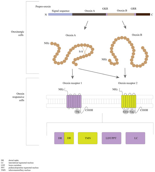 Orexins 1 and 2, also known as orexins A and B, are two oligopeptides encoded by the same precursor gene [80,81]. Orexins are produced from a polypeptide precursor, proorexin, which is a fragment of the prepro-orexin protein (Figure 2). In the mammalian brain, prepro-orexin is expressed only in neurons confined to the lateral hypothalamus, which form a single cluster of cells [82,83]. However, orexin axons innervate other hypothalamic nuclei, the limbic system, thalamus, neocortex, trunk, and spinal cord. This type of organization of orexinergic neurons is conserved across all mammals investigated [84]. In addition to the regulation of sleep–wake cycle regulators, orexins are also involved in the regulation of the feeding behavior and cardiovascular system, energy homeostasis, arousal, and stress. Orexinergic neurons are projected, particularly to noradrenergic cells of the locus coeruleus, causing depolarization and activation of these cells. From the lateral hypothalamus, orexin bundles of axons to the spinal cord [66,83]. This fiber distribution has been proven through investigating the expressions of the orexin G protein-coupled receptors–orexin receptor 1 and orexin receptor [84,85] (Figure 2).