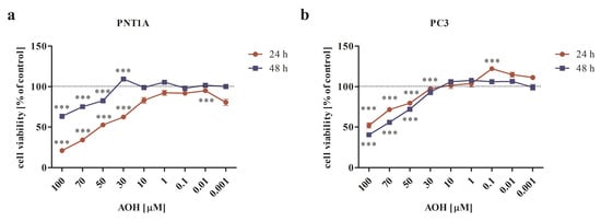 First, the cytotoxic effect of AOH was verified in a dose- and time-dependent manner. The tested dose range was similar to our previous study [21]; however, a different cell culture medium influenced the response of normal prostate cells to AOH. Therefore, the experiments were conducted, and data are hereby shown again. It was observed that AOH significantly affected the viability of both normal and cancer cells in doses higher than 30 µM upon 24 and 48 h of exposure (Figure 1a,b) (p < 0.001). Interestingly, we observed that for normal prostate cells, longer incubation times decreased the cytotoxic effect of AOH (Figure 1a), which was not observed for PC3 cells. Based on these results and our previously published data [20], for the rest of the experiments, two doses of AOH have been chosen: 10 µM and 0.1 µM, and one incubation time: 48 h.