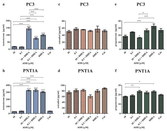 To assess the influence of AOH on local steroidogenesis, cells were treated with both AOH and DHEA, and the production of testosterone, estradiol, and progesterone was assessed (Figure 2). As expected, the highest changes were found for the production of testosterone. Furthermore, we observed that in the case of cancer cells, AOH had a higher impact on the chosen hormones’ production. In both normal as well as cancer cell lines, AOH itself did not change the production of testosterone (Figure 2a,b), although in the presence of DHEA, which itself significantly increased the production of testosterone (*** p < 0.001) as compared to control cells, AOH modulated the production of testosterone. In PC3 cells, a statistically significant increase in the production of testosterone was observed for 10 µM of AOH + DHEA, as compared to the control (*** p < 0.001), 10 µM of AOH (*** p < 0.001), DHEA (*** p < 0.001), and 0.1 µM of AOH + DHEA (*** p < 0.001). Here, 0.1 µM of AOH + DHEA also significantly increased the production of testosterone as compared to the control (*** p < 0.001) and 0.1 µM of AOH (*** p < 0.001), but the effect was lower than that caused by DHEA itself. In the normal prostate cell line, both doses of AOH and DHEA caused a significant increase in testosterone production in comparison to the control (*** p < 0.001) and treatments with AOH alone (*** p < 0.001). No significant changes were observed between the treatments with AOH + DHEA and DHEA, indicating that in the case of PNT1A cells, the observed effect of AOH + DHEA is primarily dependent on DHEA. Next, we evaluated the production of estradiol and progesterone. We did not observe significant changes in estradiol production in both cancer and normal cells (Figure 2c,d). Only a slight decrease in the production of estradiol was observed in PNT1A cells for the 0.1 µM AOH + DHEA treatment, but it was not statistically significant. The last evaluated hormone was progesterone. In the PC3 cell line, we observed that treatment with AOH insignificantly decreased the production of progesterone, as compared to control cells, whereas DHEA itself insignificantly increased it (Figure 2e). The 10 µM AOH + DHEA treatment significantly decreased the production of progesterone as compared to the control (* p < 0.05), DHEA alone (*** p < 0.001), as well as 0.1 µM of AOH + DHEA (* p < 0.05). Similarly, in normal PNT1A cells, AOH also did not significantly modulate progesterone production as compared to control cells (Figure 2f). A statistically significant decrease was observed for 10 µM of AOH compared to the 10 µM AOH + DHEA (** p < 0.01) and DHEA treatments (* p < 0.05).