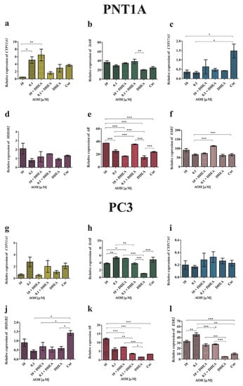 Firstly, it was found that AOH modulates the expression of CYP11A1 in PNT1a cells: 10 µM of AOH decreased its expression, whereas 0.1 µM of AOH increased it, and the effect was significantly different when compared between these groups (* p < 0.05). The observed contradictory effect was potentiated by the addition of DHEA: treatment of cells with 10 µM of AOH + DHEA significantly increased the expression of CYP11A1 as compared to 10 µM of AOH alone (** p < 0.01) as well as 0.1 µM of AOH + DHEA (** p < 0.01). In case of PC3 cells, a similar, although not statistically significant, effect was observed. The higher tested dose of AOH decreased the expression of CYP11A1, and the addition of DHEA boosted that effect. For a lower dose of AOH, no such effect was observed. In PNT1A cells, AOH insignificantly increased the expression of StAR, whereas a significant increase was observed for 10 µM of AOH + DHEA as well as 0.1 µM of AOH + DHEA, as compared to DHEA treatment alone (p < 0.05 and p < 0.01, respectively). The highest increase was observed for 0.1 µM of AOH + DHEA, which was significantly different from the control (* p < 0.05). In PC3 cells, DHEA significantly reduced the expression of StAR as compared to the control (*** p < 0.001). The higher tested dose of AOH slightly decreased, whereas the lower dose increased, the expression of StAR as compared to non-treated cells. A different effect was observed for the treatment with 10 µM of AOH + DHEA, which significantly increased the expression of StAR as compared to AOH treatment alone, as well as DHEA (*** p < 0.001 and * p < 0.05, respectively). A contradictory and significant effect was observed for 0.1 µM of AOH + DHEA (*** p < 0.001 and ** p < 0.01, respectively). In the case of CYP17A1 expression evaluated in PNT1A cells, the expression in all treatments was decreased as compared to control cells, although significant only for separated treatments of AOH (* p < 0.05). A contradictory, yet not significant, effect was observed in PC3 cells, where treatment with DHEA as well as AOH + DHEA resulted in the increased expression of CYP17A1. The expression of HSD3B2 was modulated by AOH. In PNT1A cells, an increased expression for a higher tested dose of AOH was observed as compared to control and DHEA alone, however it was not statistically significant. In PC3 cells, a contradictory effect was observed: all tested doses decreased the expression of HSD3B2, whereas statistical significance was observed for 0.1 µM of AOH, DHEA, and 0.1 µM of AOH + DHEA, as compared to the control (* p < 0.05). In the last analysis, we evaluated the expression of AR and ESR2 genes. In PNT1A, a statistically significant increase in the expression of AR was observed after treatment with 10 µM of AOH, as compared to the control as well as DHEA (*** p < 0.001). The addition of DHEA to 10 µM of AOH resulted in a significant decrease in the expression of AR as compared to 10 µM of AOH and the control (* p < 0.05). A contradictory effect was observed for a lower tested dose of AOH, which itself only slightly increased the expression of AR, whereas simultaneous treatment with DHEA resulted in a significant increase in the expression of AR as compared to 0.1 µM of AOH (p < 0.001), DHEA (*** p < 0.001), as well as the control (*** p < 0.001). In cancer cells, AOH at a dose of 10 µM caused the highest increase in the expression of AR as compared to the control and the DHEA treatment (*** p < 0.001). The addition of DHEA to 10 µM of AOH resulted in a decrease in the expression of the tested gene, but still presented a significantly higher expression as compared to the control (*** p < 0.001) and DHEA (*** p < 0.001). A similar effect was observed for a lower tested dose of AOH, but to a lower extent than that for 10 µM, as compared to 0.1 µM of AOH (** p < 0.001) and DHEA (*** p < 0.001). The evaluation of the ESR2 gene also showed that AOH at a dose of 10 µM affected the tested gene in both normal as well as cancer cell lines. In PNT1A cells, we observed a non-significant increase after treatment with 10 µM of AOH compared to the control, whereas treatment with 0.1 µM of AOH + DHEA resulted in a significant increase in the expression of ESR2 as compared to 0.1 µM of AOH alone (*** p < 0.001), DHEA (*** p < 0.001), as well as the control (*** p < 0.001). In PC3 cells, the effect of AOH was also observed both in separated treatments as well as co-treatments with AOH. Both doses of AOH resulted in an increased expression of ESR2 as compared to the control (*** p < 0.001) and DHEA (*** p < 0.001). The treatment with AOH + DHEA also increased the expression of ESR2, but to a significantly lower extent than AOH alone. Moreover, a similar effect of DHEA in PC3 cells was observed in the case of the expression of both tested receptors: DHEA significantly decreased the expression of AR and ESR2 as compared to non-treated cells.