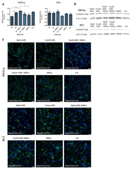 CAV-1 allows binding of the cholesterol and regulates the intracellular transport of cholesterol to and from the plasma membrane [26]. The structure of AOH resembles endogenous molecules such as cholesterol [10]; hence, this may provide the key for understanding its complex biological functions, including the modulation of the process of steroidogenesis. Therefore, during the evaluation of the effect of AOH on prostate cells’ steroidogenesis, we also decided to evaluate the possible changes in CAV-1 expression and localization, due to the known role of CAV-1 in prostate cancer [27]. Firstly, we evaluated the changes in the gene expression and observed that in PNT1A cells, 10 µM of AOH significantly reduced the expression of CAV-1 as compared to the control (** p < 0.01) as well as 0.1 µM of AOH (* p < 0.05) and 10 µM of AOH + DHEA (*** p < 0.001) (Figure 4a). DHEA itself decreased the expression of CAV-1, and a similar effect was observed for 0.1 µM of AOH + DHEA as compared to 0.1 of µM AOH; however, the differences were not statistically significant. In case of PC3 cells, almost no changes in the expression of CAV-1 were observed, besides the insignificant decrease upon 0.1 µM AOH + DHEA treatment. A similar tendency was observed for the protein expression of CAV-1 obtained in the Western blot analysis (Figure 4b and Table 1). For both cell lines, the expression of CAV-1 was slightly decreased after AOH treatment and increased after AOH + DHEA treatment. The altered expression might be associated with the different observed localization of AOH in cells (Figure 4c). In PNT1A cells, fluorescent staining of CAV-1 after AOH treatment showed a cell membrane and nuclear localization instead of predominantly cytosolic localization in control cells. In case of PC3 cells, a similar effect was observed for lower-dose AOH treatment rather than the higher dose of AOH.