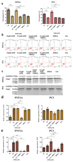 Next, we evaluated the cell cycle and process of apoptosis in prostate cells, due to the fact that all of them are associated with the steroidogenesis process both in normal as well as cancer cells [28]. Firstly, the induction of apoptosis was evaluated with flow cytometry (Figure 5a,b), and it was revealed that in both normal as well as cancer cell lines, AOH at a dose of 10 µM induced a significant increase in the number of apoptotic cells (*** p < 0.001) as compared to the control. In the case of a lower tested dose (0.1 µM of AOH), no such effect was observed, similarly to DHEA treatment. Simultaneous treatment with AOH + DHEA resulted in a significant increase in the number of apoptotic PC3 cells as compared to AOH treatment alone (** p < 0.01) and DHEA (*** p < 0.001). In both cases, the increased number of apoptotic cells was associated with an increased number of early apoptotic cells rather than dead cells, as visible on flow cytometry histograms (Figure 5b). The increase in the number of apoptotic cells in PC3 cells corelated with the observed modulation of the expression of caspase 3 on the protein level (Figure 5c and Table 2), whereas in the case of PNT1A cells, the expression of caspase 3 was increased only in the 10 µM + DHEA treatment, as compared to non-treated cells. We also evaluated the expression of ANXA5 (Figure 5d) and observed that in PNT1A cells, 10 µM of AOH caused a significant decrease in the expression of ANXA5, as compared to the control cells (*** p < 0.001), whereas 10 µM of AOH + DHEA resulted in no change in the expression as compared to the control. A contradictory effect was observed for a lower dose of AOH (Figure 5d). In the case of PC3 cells, modulation of ANXA5 expression was not significant, although a similar trend was observed to a lower extent (Figure 5d). In the case of the expression of TP53 in both cell lines, a similar effect was observed (Figure 5e). Treatment with 10 µM of AOH resulted in decreased expression, whereas the higher dose did not cause any change in expression as compared to the control in PC3 cells (** p < 0.01). In the case of TP53, we noticed that AOH led to an insignificant expression decrease in PNT1A cells, while the addition of DHEA resulted in a significant increase in expression in the case of a higher dose of AOH (*** p < 0.001) and a significant decrease in the expression in the case of a lower dose (* p < 0.05). DHEA itself caused a significant decrease in the expression of TP53 as compared to control cells (** p < 0.01). A similar effect was observed in PC3 cells, but to a higher extent (Figure 5e). These changes might be explained by the fact that in the case of PC3 cells, more dead cells were observed as compared to PNT1A cells after AOH treatment, indicating that the induction of apoptosis by AOH is not a main effect of its action.
