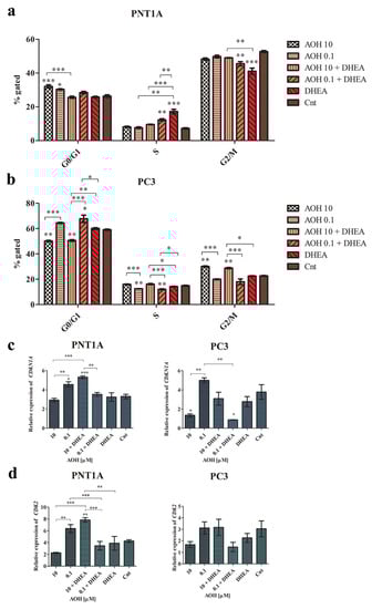 We have also found that AOH differently modulated the cell cycle progression in normal and prostate cancer cells. In normal PNT1A cells, a significant increase in the number of G0/G1 cells was observed for both tested doses of AOH (*** p < 0.001 and * p < 0.05, respectively), compared to non-treated cells. DHEA as well as DHEA + AOH increased the number of cells in the S cell cycle phase, with a simultaneous decrease in the number of cells in the G2/M cell cycle phase (Figure 6a). The increase in the number of cells in the S phase of the cell cycle, as the well as the decrease in the G2/M cell cycle phase, was statistically significant for 0.1 µM of AOH + DHEA, as compared to 0.1 µM of AOH alone (** p < 0.01) and DHEA alone (** p < 0.01). In PC3 cells, a different effect was observed: AOH at a dose of 10 µM induced a significant increase in the number of cells in the G2/M cell cycle phase compared to the control (** p < 0.01). Simultaneous treatment with DHEA resulted in a similar effect. For a lower tested dose of AOH, a significant decrease in the number of cells in the S cell cycle phase was observed as compared to non-treated cells (** p < 0.01), with no significant increase in the number of G0/G1 cells (Figure 6b).