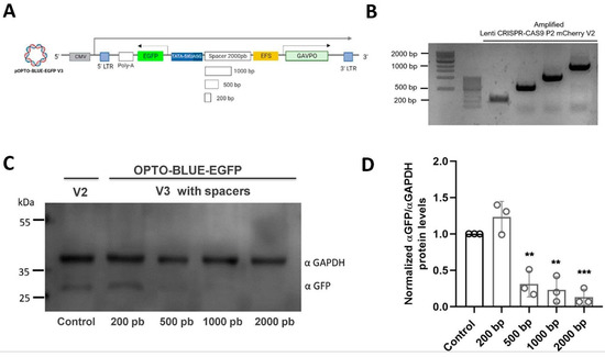 Evaluation of EGFP expression in darkness using different spacers between the promoters of the pOPTO-BLUE vector (UAS and EFS) in HEK293-T cells. (A) Shows the schematic illustration of the pOPTO-BLUE-GFP-V3 lentiviral vector with different versions of spacers. (B) PCR amplification from the plentiCRISPR-CAS9-P2-mCherry-V2 was performed to obtain amplicons of different sizes (2000 bp, 1000 bp, 500 bp, and 200 bp). In (C), HEK293-T cells were transfected with the pOPTO-BLUE-EGFP vector + spacers and kept in darkness for 24 h. Subsequently, cells were homogenized to detect and quantify by Western blot the expression of EGFP and GAPDH (as load control) using specific antibodies. (D) EGFP protein levels were quantified by densitometry, as indicated in the material and methods section. The intensity of EGFP bands was normalized with the intensity of GAPDH bands. Different asterisks (*) indicate significant differences between dark and light conditions. A two-way ANOVA test following Bonferroni’s post hoc test was performed (** p < 0.01 and *** p < 0.001).