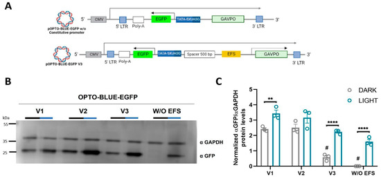 Blue light-mediated EGFP expression is induced by the different versions of the pOPTO-BLUE-EGFP (V1, V2, V3, and V2_W/O EFS) lentiviral vector in HEK293-T cells. (A) Schematic illustrations of the pOPTO-BLUE-EGFP lentiviral vector with a 500 bp spacer (pOPTO-BLUE-EGFP-V3_500bp) and another version of the pOPTO-BLUE-EGFP-V2 plasmid without constitutive EFS promoter (W/O) are shown. (B) Different versions of the pOPTO-BLUE-EGFP lentiviral vector (V1, V2, V3, and V2_W/O) were transfected into HEK293-T cells for 8 h. Then, one experimental group was kept in darkness, while another experimental group of cells was exposed to blue light for 16 h. Finally, a Western blot was performed to detect EGFP protein levels. GADPH was used as a loading control. (C) As indicated in the material and methods section, EGFP protein levels were quantified by densitometry. The intensity of EGFP bands was normalized with the intensity of GAPDH bands. Different asterisks (*) indicate significant differences between dark and light conditions, and pound sign (#) indicates significant differences between dark conditions with different plasmid versions. A two-way ANOVA test following Bonferroni’s post hoc test was performed (** p < 0.01 and **** p < 0.0001) (# p < 0.001).