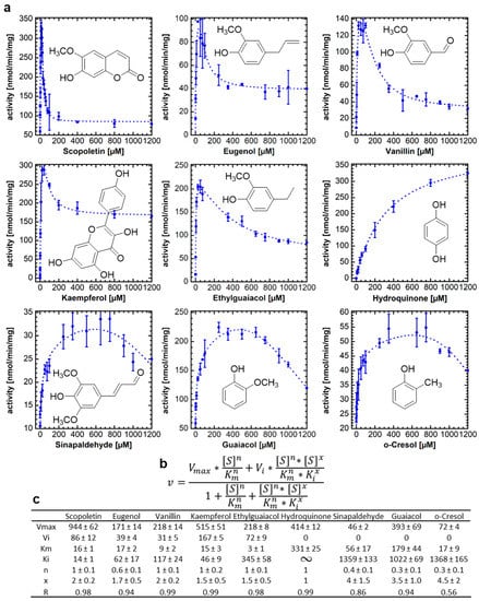 In a previous study, we showed that the promiscuous NbUGT72AY1 can glucosylate phenolics as well as short-chain alcohol, terpenoids, and apocarotenoids []. Since NbUGT72AY1 was strongly substrate-inhibited by hydroxycoumarins, vanillin, and carvacrol, but only weakly by monolignols [], we performed further biochemical studies to reveal structure–function relationships. Enzyme activity studies carried out by UDP-GloTM glucosyltransferase assay, with naturally occurring substrates structurally related to scopoletin and vanillin, showed a wide range of different activity profiles, ranging from Michaelis–Menten (MM) kinetics (hydroquinones) over weakly inhibited (sinapaldehyde, guaiacol, and o-cresol) to strongly substrate-inhibited profiles (scopoletin, eugenol, and vanillin) (Figure 1a). The equation that best explained the data for all substrates combines the two-binding site kinetic model for sequential ordered binding [] and the Hill equation []. The equation contains two Hill coefficients, n and x, where x accounts for the possibility that substrate binding can also be cooperative in the inhibitory mode (Figure 1b). The equation becomes an MM equation when n and x are equal to 1, Vi is equal to 0, and Ki approaches infinity, as in the case of hydroquinone (Figure 1c). Complete substrate inhibition can be recognized by the fact that Vi is equal to 0 (sinapaldehyde, guaiacol, and o-cresol). All ortho-substituted phenols show SI kinetics, while para-substituted hydroquinone is not inhibited by the substrate. Kaempferol is a special case, as two products, kaempferol-3-O-glucoside and -7-O-glucoside, were formed (Figure S2). The replacement of the methoxy group in guaiacol with a methyl group, as in o-cresol, led to a strong decrease in Vmax (393 ± 69 vs. 72 ± 4 nmol/min/mg) and Km (179 ± 44 vs. 17 ± 9 µM), while other parameters were not significantly different, highlighting the importance of an ortho-substituent for substrate binding in the catalytic site. A third substituent appears to enhance the SI, as shown by the comparisons of guaiacol with ethylguaiacol/eugenol/vanillin. A fourth substituent, as in scopoletin and sinapaldehyde, leads to different outcomes.