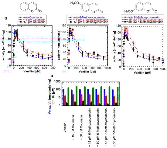Enzyme activity of NbUGT72AY1 toward vanillin in the presence of different coumarins. (a) NbUGT72AY1 was used to glucosylate vanillin in the presence of different concentrations of coumarin, 6-methoxycoumarin, and 7-methoxycoumarin. Enzyme activity was determined by UDP-GloTM Glycosyltransferase assay and fitted to the equation shown in Figure 1. (b) Kinetic parameters of NbUGT72AY1 using vanillin as acceptor substrate in the presence of coumarins. Please note that the y-axis is displayed logarithmically to display the entire range of values. The colors of the bars are explained on the y-axis. Experimental values were fitted to the equation shown in Figure 1 (n = 1; x = 2). Parameters are not significantly different (p < 0.01).
