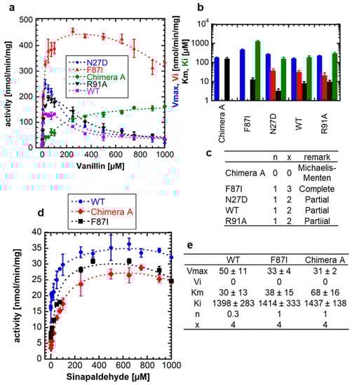 While mutants N27D and R91A showed a strong SI similar to the WT with comparable kinetic data, except for the Vmax of N27D, which was significantly different from the value of the WT, F87I and chimera A showed a weak SI (Ki = 1261 ± 128 µM) and MM kinetics, respectively (Figure 3b,c). Thus, the catalytic activity of NbUGT72AY1 and its mutants toward vanillin resembles that of the enzymes toward scopoletin, implying that the phenolic aldehyde should interact with the same amino acids of the proteins as the phenolic lactone. In contrast, WT NbUGT72AY1, as well as the F87I and chimera A mutants showed mild SI with sinapaldehyde (Figure 3d).