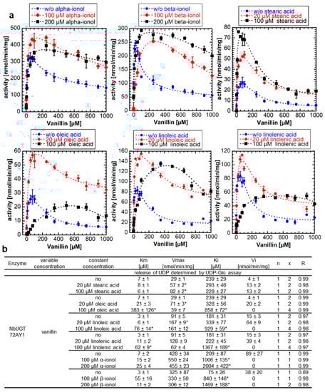 Apocarotenoids, including α- and β-ionol, have been shown to increase the glucosylation activity of NbUGT72AY1 toward scopoletin by decreasing SI due to increasing Ki levels [] and UDP-glucuronosyltransferase 1A1 activity is inhibited by fatty acids []. Therefore, we analyzed the effect of the naturally occurring effectors α- and β-ionol (100 µM and 200 µM each) and fatty acids such as stearic acid, oleic acid, linoleic acid, and linolenic acid (20 µM and 100 µM each) on the enzymatic activity of NbUGT72AY1 toward vanillin (Figure 4a). The addition of α- and β-ionol to the reaction resulted in a concentration-dependent increase in Ki and reduced Vi to zero (complete uncompetitive SI) (Figure 4b). Similarly, the addition of C18 fatty acids altered the course of the enzymatic reaction curve, but in different ways.