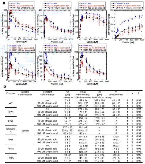 Enzyme activity of NbUGT72AY1 mutants toward vanillin in the presence of putative effectors. (a) Wild-type (WT) and mutant proteins were used to glucosylate vanillin in the presence of stearic acid. Experimental data were determined by UDP-GloTM Glycosyltransferase assay and fitted to the equation shown in Figure 1. (b) Kinetic parameters of WT and mutant proteins using vanillin as substrate with stearic acid. Asterisks (*) indicate that the values are statistically significantly different according to a t-test (p < 0.01) from the values for the samples without addition of the effectors.