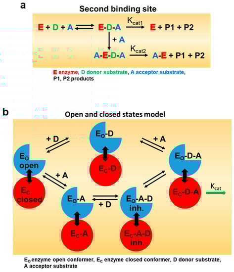Model for enzymatic substrate inhibition. (a) In the classical model for substrate inhibition the enzyme has catalytic activity when one substrate is bound, but reduced (Kcat2 < Kcat1) or even no activity Kcat2 = 0) if two are bound (adapted from []). The color code is explained in the sub figure. (b) In the open and closed states model, inhibitory concentrations of acceptor substrate A lead to a faster and more cooperative domain closure by donor substrate D, leading, in turn, to an increased population of the closed inhibited state (EC-A-D). Too rapid a premature closure of the domain could interfere with substrate-binding mechanisms (adapted from []).